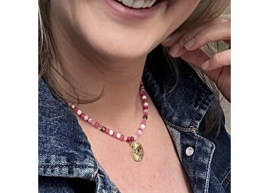 Necklace Details: Round beads: 6mm stones made of green jade, white and pink agate, and clear rock crystal – smooth, polished, and full of...
