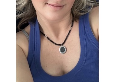 Ten elegancki naszyjnik wykonany jest z kulek czarnego agatu o średnicy 4 mm oraz kulek ze stali nierdzewnej antyalergicznej. Centralnym elementem naszyjnika jest płaski kamień szungitu o średnicy 2 cm, oprawiony w ramkę również ze stali nierdzewnej.